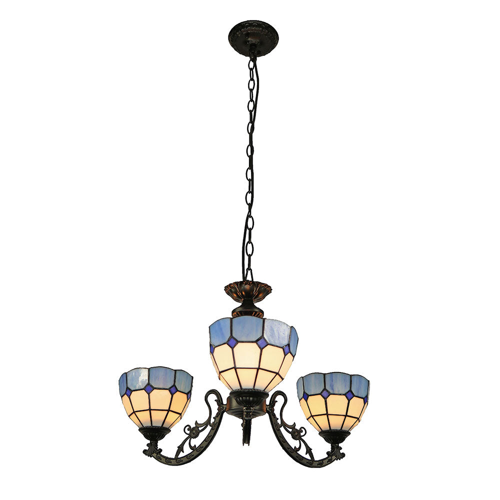 Elevate your living space with the exquisite charm of the 3 Light Blue & White Geometric Tiffany Facing Up Pendant. Inspired by the Art Deco era and the innovative designs of Louis Comfort Tiffany, this pendant showcases a dazzling array of stained art glass that adds a touch of glamour and character to any room. Crafted with a hand-painted and kiln-fired shade, this Tiffany style lamp boasts a vibrant and intricate design that will illuminate and decorate your home with its energy-efficient LED-ready bulbs. Perfect for spaces like home offices, family rooms, and living areas, this pendant exudes both elegance and timeless beauty.Specifications