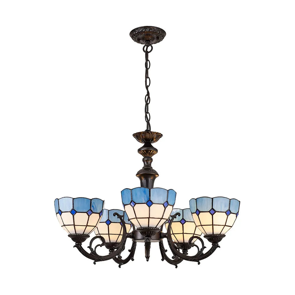 Elevate your living space with the exquisite 5-Shade Upward Pendant in Blue & White Geometric design. Inspired by the Art Deco period and the innovative work of Louis Comfort Tiffany, this Tiffany-style lamp exudes glamour and charm. Crafted with hand-painted stained art glass and featuring intricate detailing, this pendant not only illuminates but also adds a touch of elegance to any room. With energy-efficient LED compatibility and dimensions of 750mm in diameter and 480mm in height, this pendant is a perfect blend of artistry and functionality for your home.Specifications