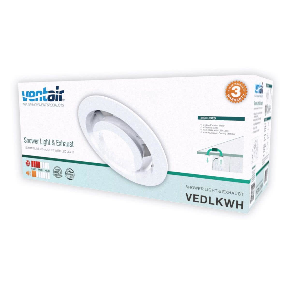 Elevate your shower experience with the Shower Light & Exhaust system, a sleek and functional addition designed for use above showers and wet areas. This innovative product boasts an energy-saving LED light that illuminates your space while the long-life ball bearing motor ensures efficient ventilation. Installation is a breeze with its user-friendly design, making it a must-have for any modern bathroom. Included in the package are essentials like a full ducting kit, an external grille, and a 4m aluminium ducting for added convenience. Model VEDLKWH, the Shower Light & Exhaust unit combines practicality with style to enhance your bathroom environment. Featuring a 150mm inline exhaust fan kit with a contemporary internal fascia hosting a 10W LED center light, this product includes an external fixed grille and a 4m aluminium ducting for optimum functionality. With specifications like a motor wattage of 25W, air delivery of 210m³/h, and a noise level of 39dB(A), this system ensures a tranquil ambiance while providing efficient ventilation. Embrace the modernity and convenience this product offers, backed by a generous 3-year warranty for peace of mind.Specifications