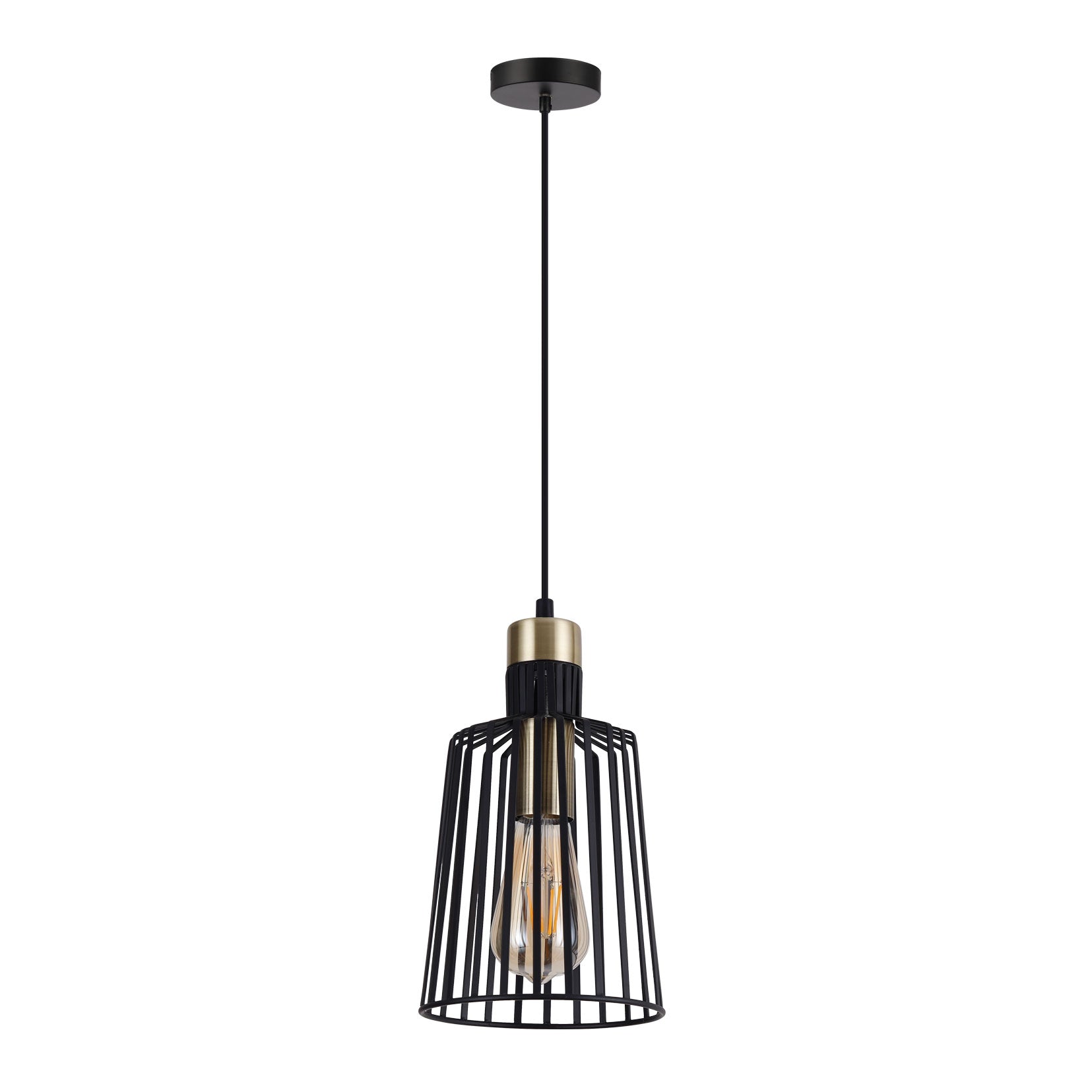 Introducing the ASHLEY-PDT Ashley Caged 1 light E27 240V Pendant - a sleek and modern addition to your space. The ASHLEY-PDT metal pendant Series boasts a contemporary wire guard shade design that brings a touch of elegance to any modern interior setting. Available in small, medium, and large sizes, this pendant is perfect for enhancing living rooms and bedrooms alike. With its plated Matt Black finish adorned with Antique Brass highlights, this pendant is part of a versatile family that includes matching desk lamps, table lamps, and hanging pendants. Choose from different sizes to suit your space and revel in the understated sophistication of the ASHLEY-PDT pendant series.Specifications
