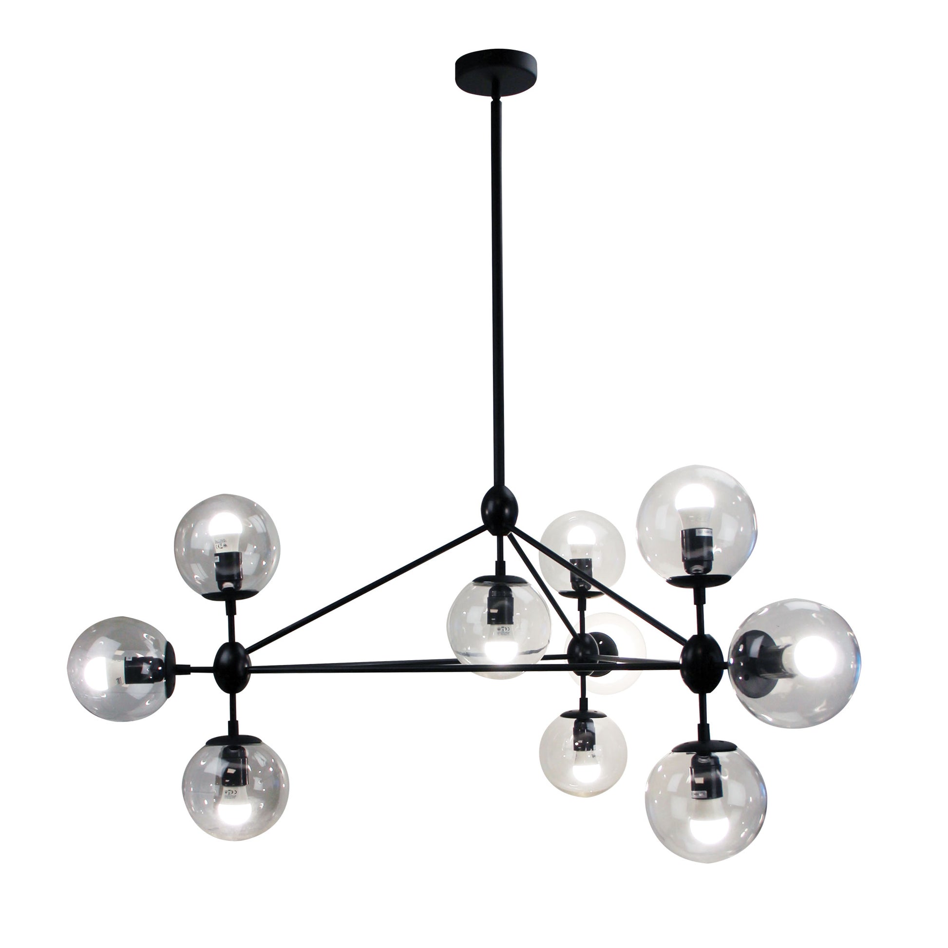 The BROCKTON 10 Light Pendant by Oriel Lighting exudes contemporary charm with its striking design in matt black finish and clear glass. This significant feature piece, supplied with three adjustable rod lengths, offers versatility in installation, ranging from a minimum height of 750mm to a maximum of 1650mm. With 10 E27 globe sockets, this pendant accommodates a maximum wattage of 40W per globe (globe not included), providing ample illumination for any modern home setting. Crafted from sturdy METAL, this pendant boasts an overall height of 165mm and dimensions of H750-1650 D1050. Warranty-wise, this fixture comes with a 12-month Replacement Guarantee and should be installed by a licensed electrician for safety and compliance with wiring standards.Specifications