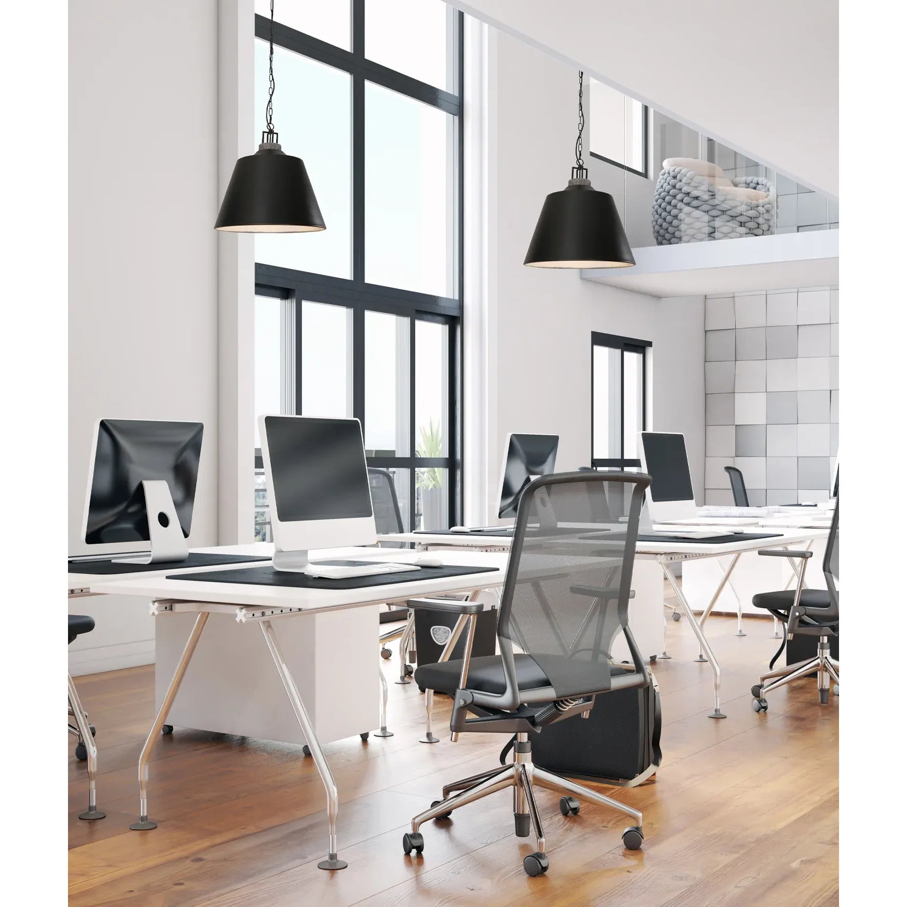 - Interior single pendant light with bell-shaped metal shade and travertine highlight