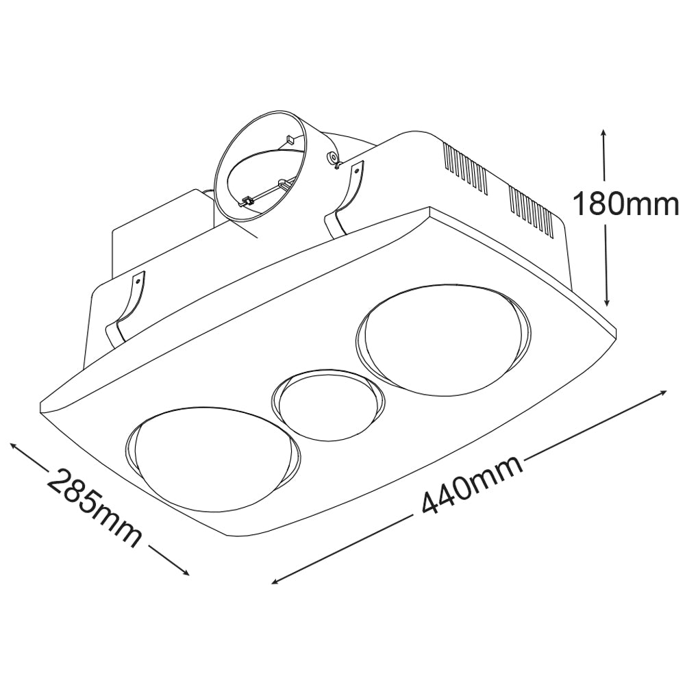 Duct Outlet Diameter: 100mm, Cutout Size: 390mm x 220mm, Depth: 200mm, Facia Size: 440mm x 285mm