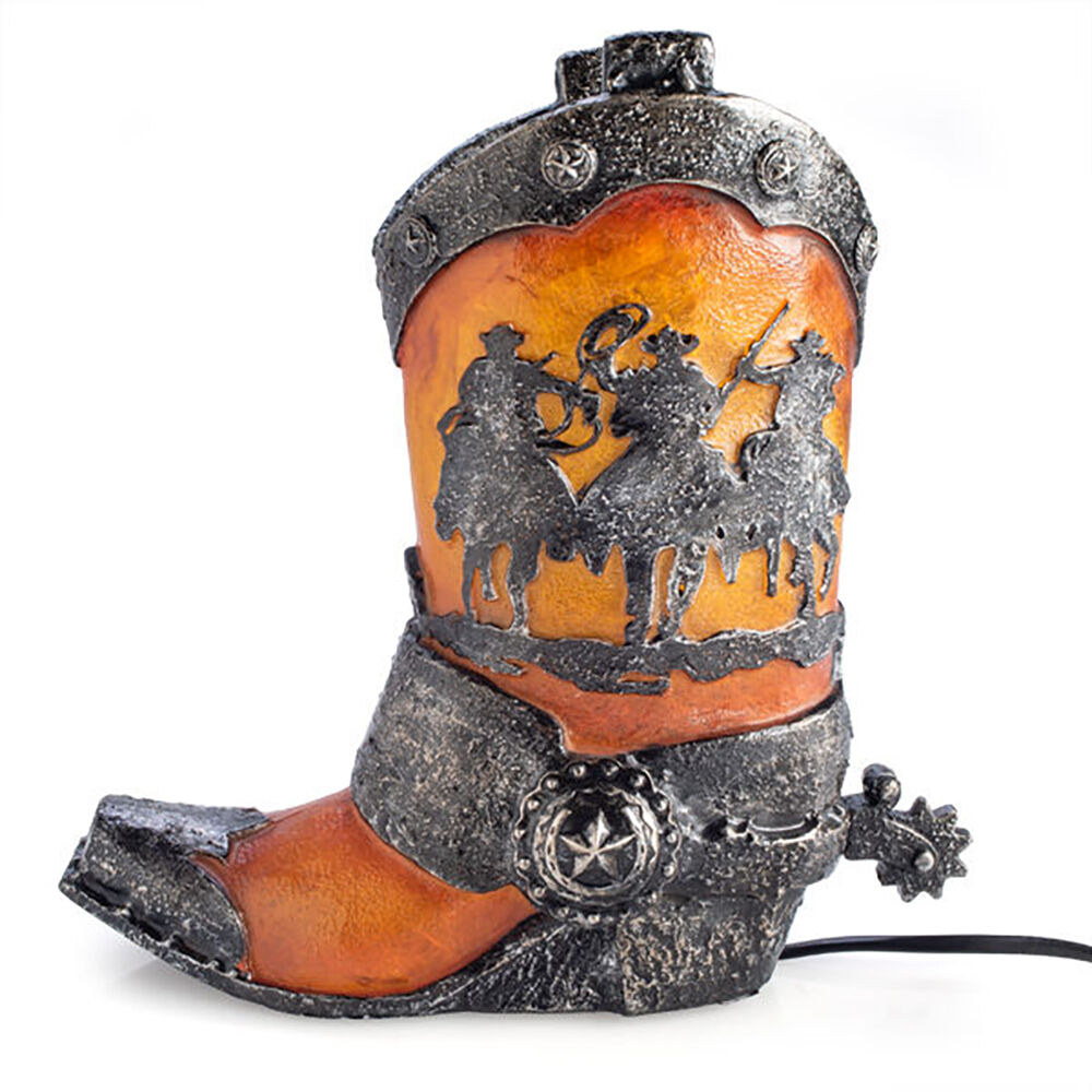 Step back in time to the rugged charm of the Old West with this Cowboy Boot Table Lamp. Imagine a detailed metal-look trimming, complete with three adventurous cowboys riding into the sunset - a scene straight out of your favorite Western flick. This lamp isn't just an illuminating piece; it's a conversation starter that captures the essence of Western adventure. Ideal for Western enthusiasts or anyone looking to add a touch of frontier spirit to their space, it's a must-have for themed rooms or as a unique gift for the cowboy at heart.Specifications