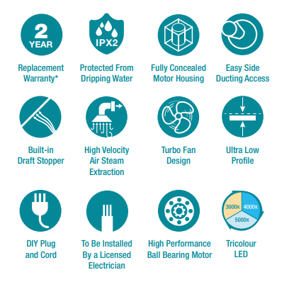 Upgrade your living space with the Martec Flow ceiling exhaust fan, a powerful yet whisper-quiet addition to your home. With a choice between LED and non-LED models, this fixture offers versatility to suit your needs. Available in 250mm or 300mm sizes, the efficient long-life premium ball bearing motor ensures optimal performance. The low-profile fascia design and easy installation process make this fan ideal for multi-storey apartments. Equipped with a turbo fan blade design for efficient air-steam extraction, this Martec ceiling fan provides a refreshing airflow of 290m³/hr for the 250mm model and 390m³/hr for the 300mm model. Enjoy the convenience of the side duct outlet with a draft stopper, and rest assured with the IPX2 Water Resistant feature. Elevate your indoor environment with the Martec Flow ceiling exhaust fan, designed for seamless integration and lasting performance. This sleek fixture boasts a 2-year replacement warranty, providing peace of mind for your investment. The DIY models come complete with a 1-meter cord and 3-pin plug, ensuring straightforward installation for added convenience. Crafted from durable ABS material, the housing fascia ensures longevity and easy maintenance. With a width of 300mm and a cut-out of 295mm, this fan is perfect for indoor use, delivering efficient air extraction with a wattage of 60W. Trust in Martec's expertise and the Flow collection's quality to enhance your space with a touch of modern functionality.Specifications