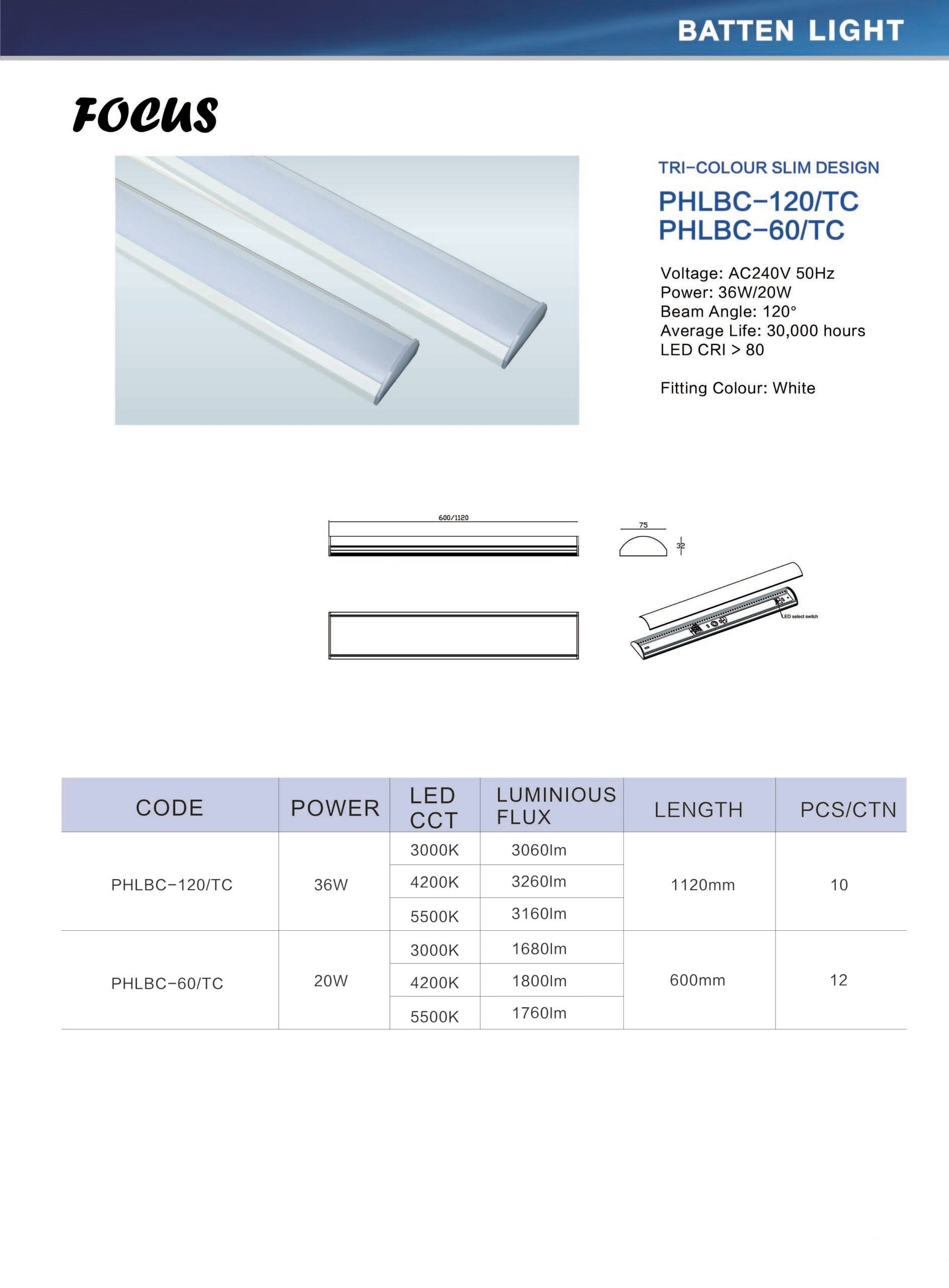 Experience the elegance and efficiency of the Focus batten light, a sleek lighting solution that effortlessly enhances any space. Whether it's illuminating storerooms, garages, or even a studio, this light boasts a slender 75mm design complemented by an Opal diffuser. Available in two sizes, the 20watt (60cm) and 36watt (120cm) models provide versatility to suit your specific needs. Embrace the beauty of simplicity with its steel backplate, painted in a crisp white finish, along with an IP20 Rating for added durability. The Focus features a unique TC Colour Changing Switch, allowing you to seamlessly transition between 3000K, 4200K, and 5500K options for personalized ambiance. Step into a world of modern illumination with the Focus batten light, a beacon of innovation and style. With its non-dimming functionality and a 3-year warranty, this lighting fixture delivers both reliability and longevity. The 20w Model boasts 1680 Lumens at 3000K, 1800 Lumens at 4200K, and 1760 Lumens at 5500K, while the 36w Model dazzles with 3060 Lumens at 3000K, 3260 Lumens at 4200K, and 3160 Lumens at 5500K. Say goodbye to dim spaces as this light radiates brightness, measuring 32mm tall and 75mm wide to seamlessly integrate into any environment. Elevate your lighting experience with the Focus batten light, where form meets function in perfect harmony.Specifications