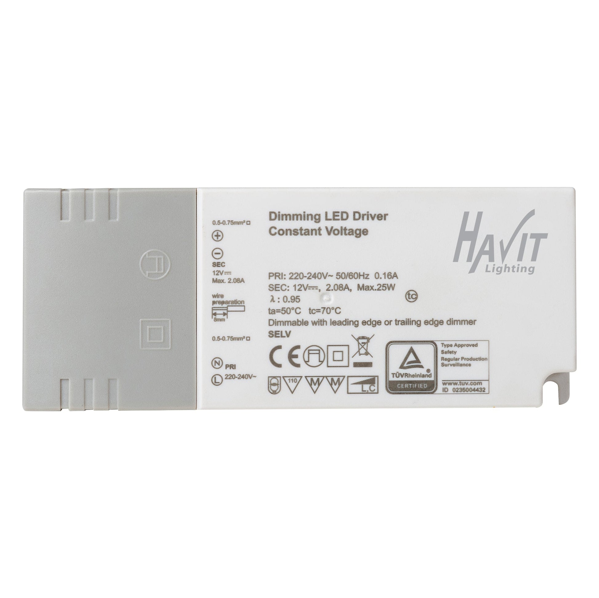 Experience seamless lighting control with the Havit Lighting Indoor LED Driver. This innovative product boasts Triac Dimmable capabilities, allowing you to adjust brightness levels from 5% to 100% effortlessly. With a wattage of 25W and the ability to handle a maximum load of 20W, this driver ensures efficient performance while maintaining a sleek and compact design. The inclusion of Flex and Plug simplifies installation, making it a versatile choice for indoor lighting solutions. Crafted by Havit Lighting, this LED driver in proper case is designed to meet your illumination needs with precision. Its white plastic construction exudes a modern aesthetic, blending seamlessly into any indoor setting. The product comes with a 3-year replacement warranty, providing you with peace of mind as you elevate your lighting experience. Trust in the Havit Lighting Indoor LED Driver (SKU: HV9668-12V25W) for reliable performance and customizable dimming options, all under the guidance of a licensed electrician for safe installation.Specifications