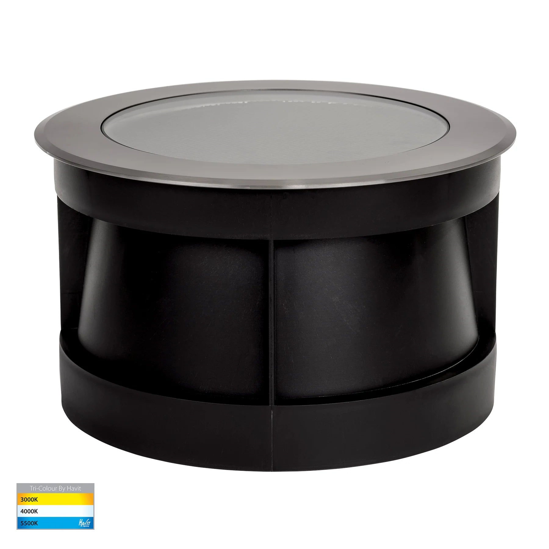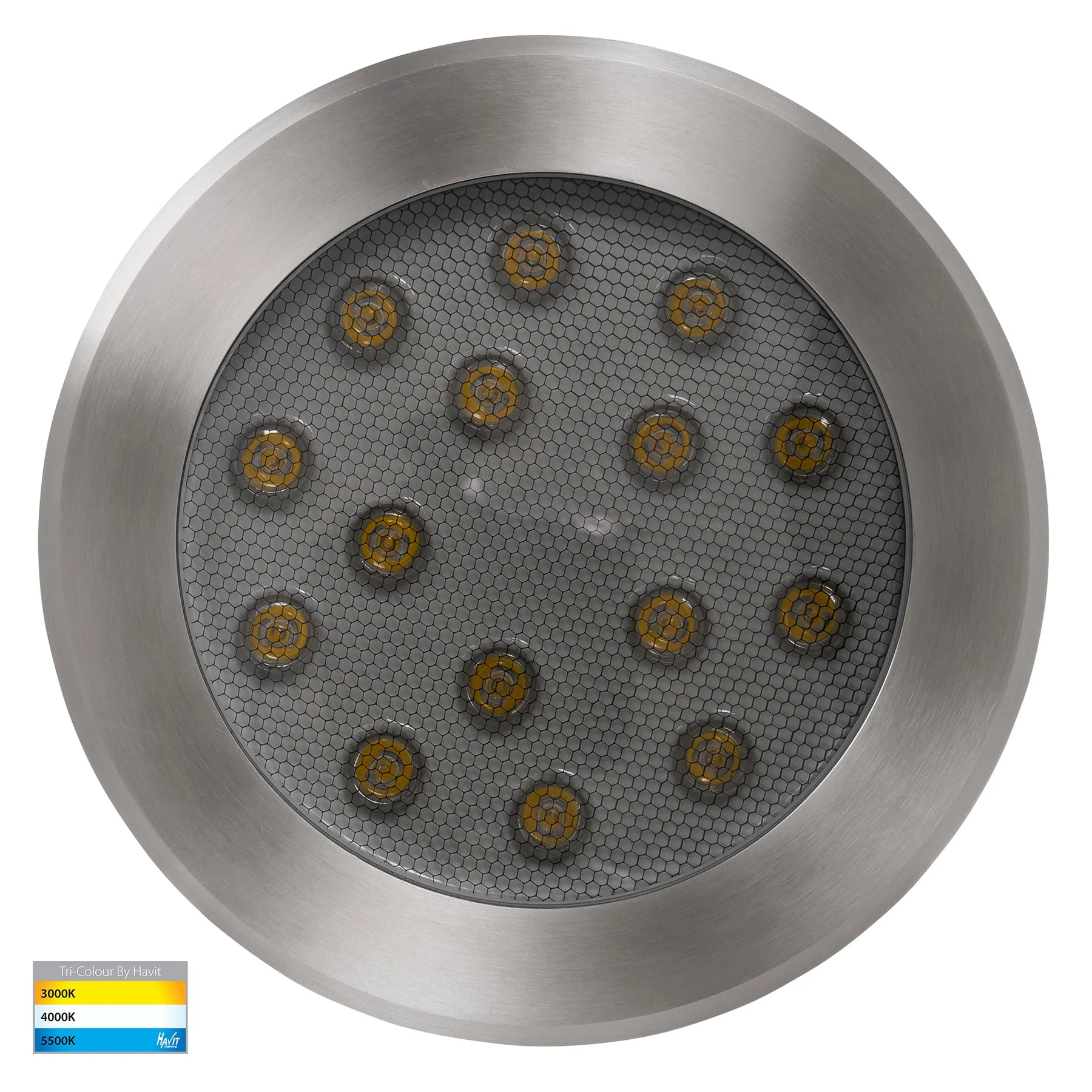 Enhance the ambience of your outdoor spaces with the In-ground Uplighter Round, boasting a sleek 316 Stainless Steel Marine Grade Cover and a robust full stainless steel body. Emitting a bright glow with its built-in 18w LED, this recessed inground light features a flush tempered glass and an anti-glare honeycomb louvre for a sophisticated illumination experience. With a 60° beam angle and TRI Colour options, this uplighter offers versatility and durability, boasting an IP67 rating and an IK10 rating for resilience against various outdoor conditions.Specifications
