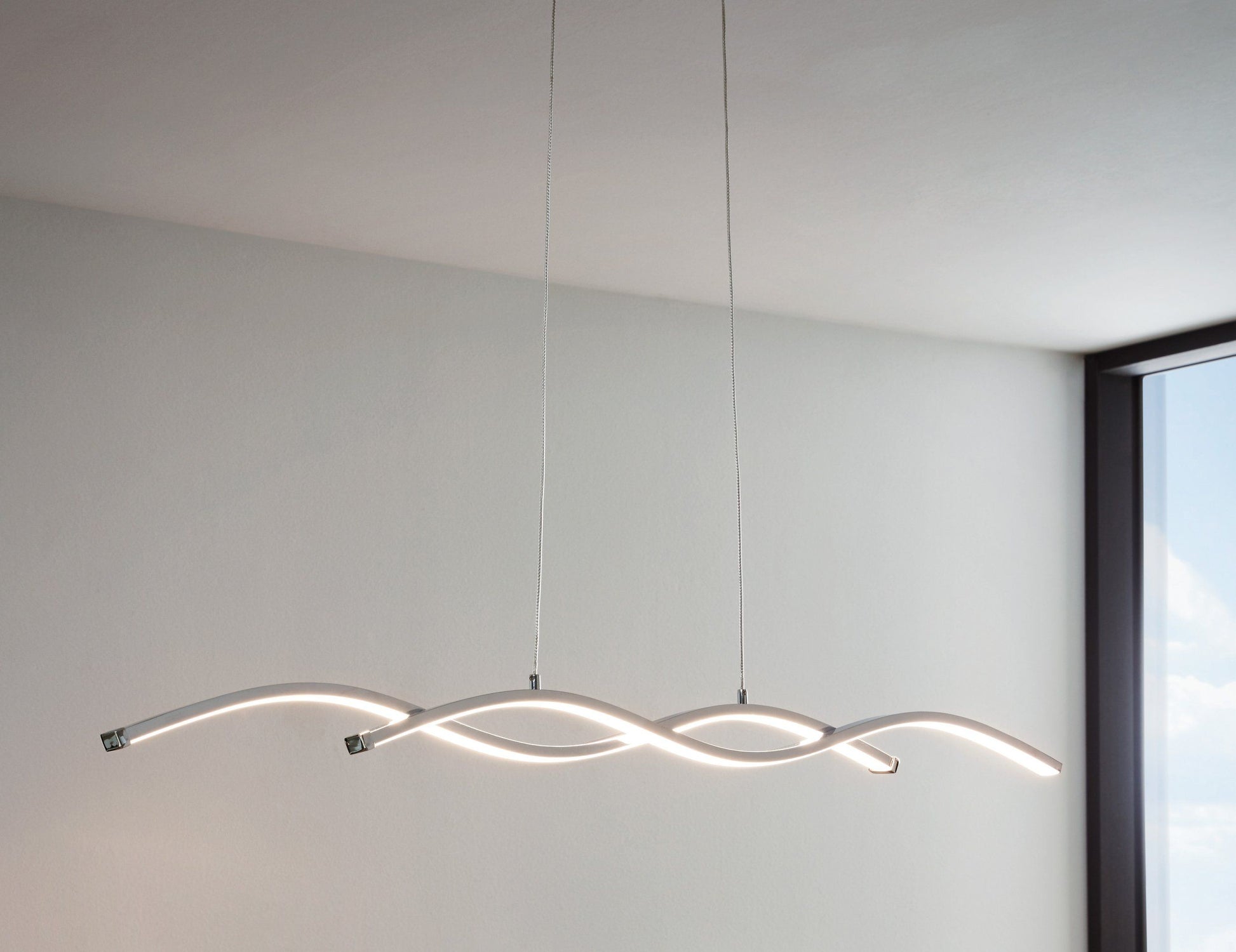 Elevate your living space with the captivating Lasana 2 pendant light from Eglo. This modern marvel showcases a sleek design featuring two LED strips gracefully suspended in a mesmerizing wave pattern. Each strip delivers 14 watts of luminous power, illuminating your room with an impressive 3800 lumens of cozy 3000K warm white light. The pendant's adjustable height of 1200mm provides flexibility to tailor the lighting precisely to your space, ensuring a perfect fit for your home ambiance. Crafted with a blend of steel, aluminium, chrome, and white finishes, the Lasana 2 pendant light exudes contemporary elegance while offering practicality. Boasting an integrated LED globe base and a wattage of 28W, this lighting fixture combines style with efficiency. With a 2-year replacement warranty, this IP20-rated pendant is ideal for indoor installations and promises to enhance your room with its sophisticated charm. Let the Lasana 2 illuminate your surroundings with a touch of modern sophistication and radiant warmth.Specifications