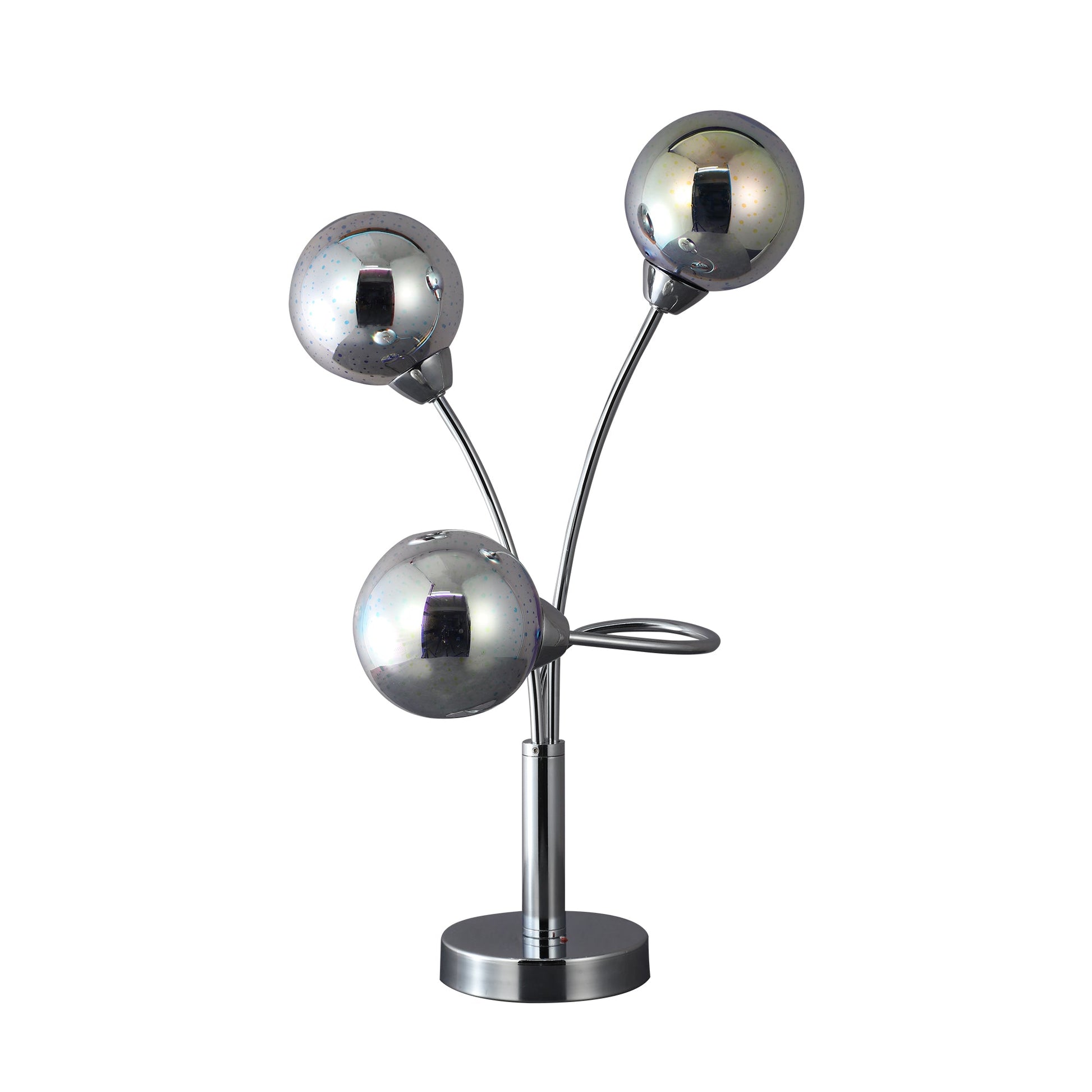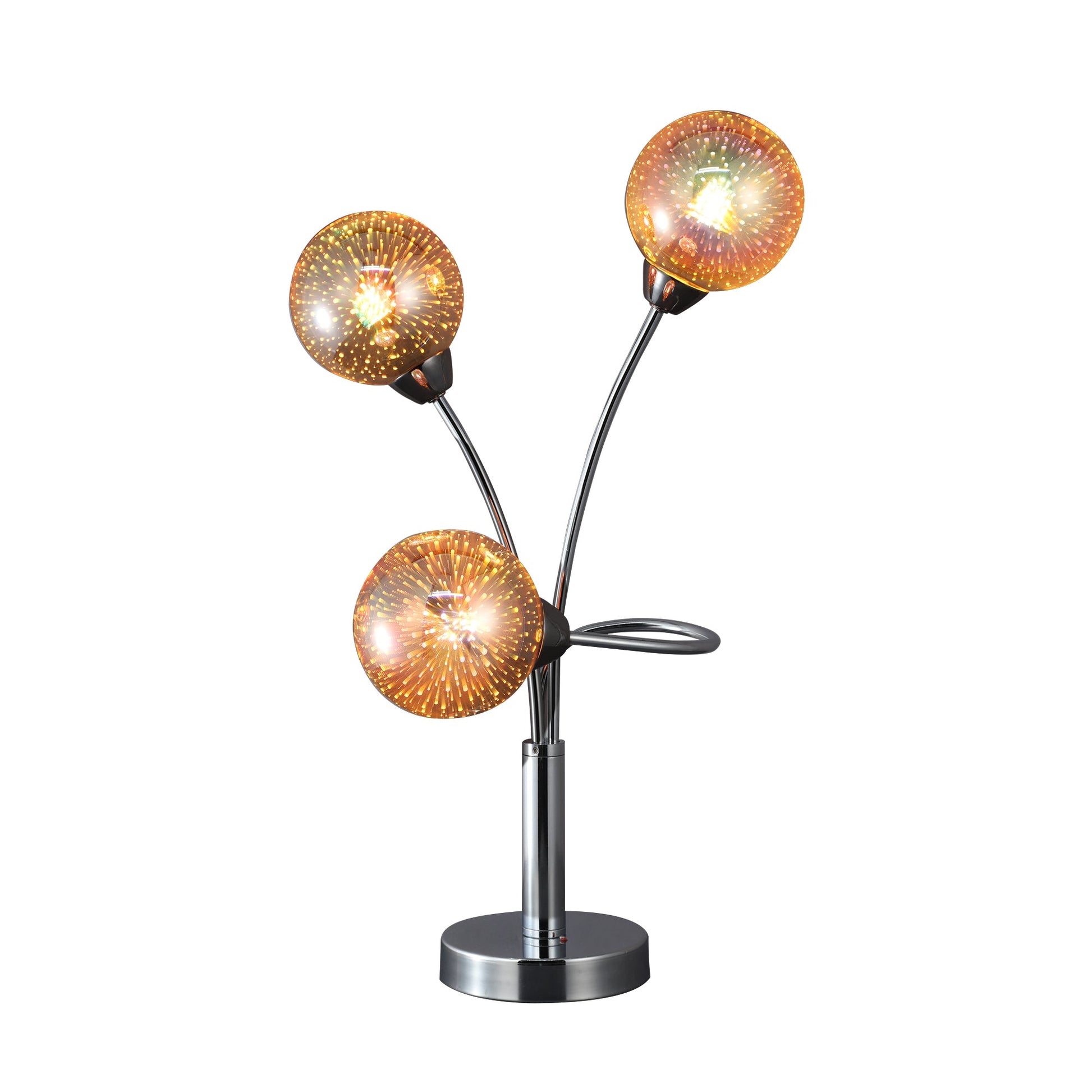 Elevate your space with the Candice Table and Floor Lamp, a stunning blend of modern design and innovative lighting. This sleek fixture, featuring three captivating sphere lights emerging from a chrome upright stand, exudes contemporary elegance. When illuminated, the spheres emit a mesmerizing glow, creating a futuristic ambiance that draws the gaze of all beholders. The Candice Lamp is a versatile addition to any room, infusing it with a unique and captivating light source. Crafted from sturdy METAL and delicate GLASS materials, the Candice Lamp stands at H 480mm with a base dimension of W 150mm and D 250mm. Weighing 1.2kg, this lamp offers a striking chrome finish that transforms its appearance when lit. Boasting a total of three G9 bulbs with a wattage of 3.3W each, this lamp provides a warm 2700K COLOR TEMP and 310 LUMENS to illuminate your space with a subtle yet radiant glow. Complete with an ON/OFF in-line switch and a care instruction to simply wipe with a dry cloth, the Candice Lamp combines style and functionality seamlessly.Specifications