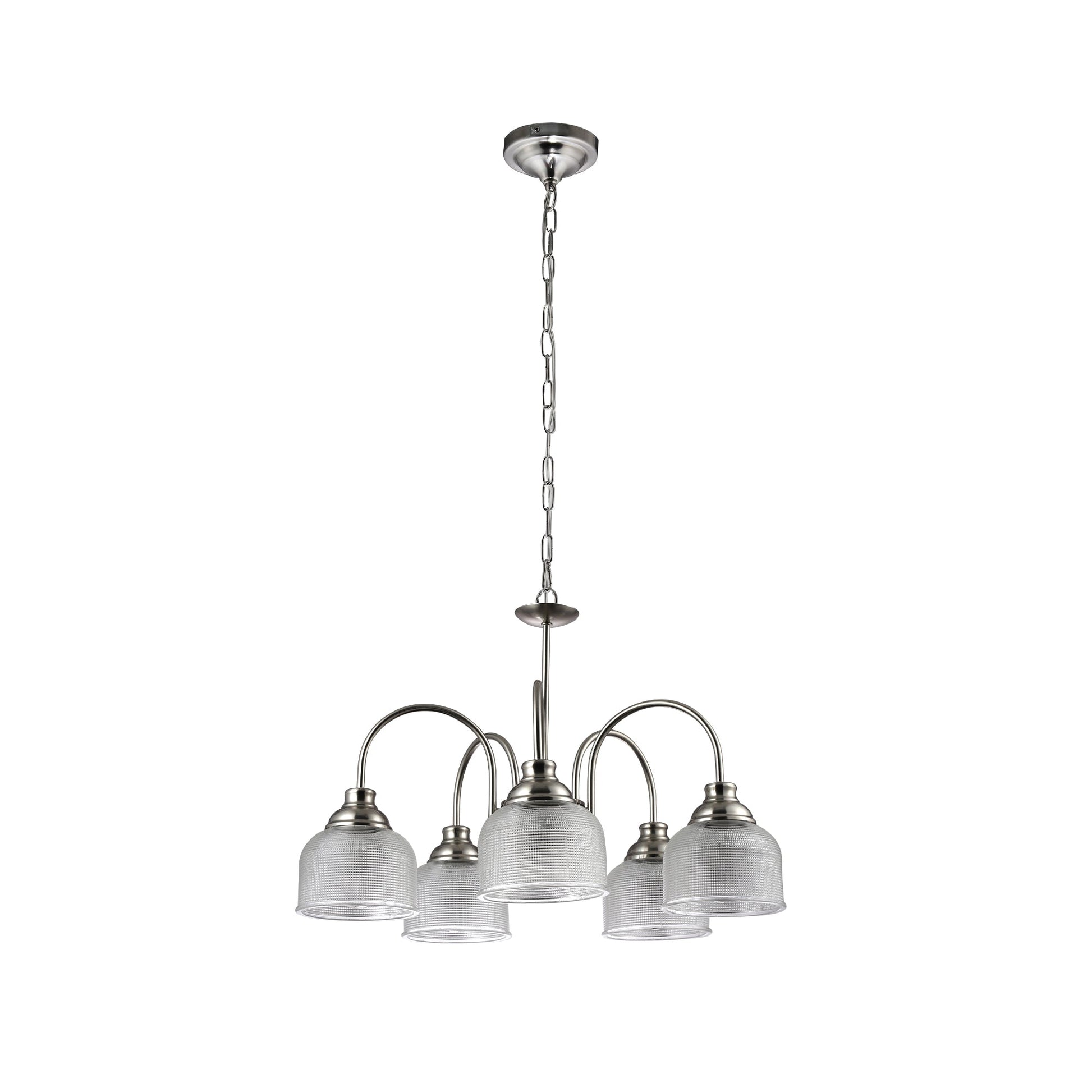 Enhance the ambiance of your dining or lounge room with the Aviva Chandelier, a stunning ceiling light fixture designed to captivate. The satin chrome finish of the base, chain, and elegant curved lighting rods exude traditional charm, while the exquisite glass bowl-shaped diffuser adds a touch of sophistication. Available in both three and five light options, this chandelier offers a versatile choice to seamlessly blend with your home decor and meet your lighting needs perfectly. Crafted from a blend of METAL and glass, the Aviva Chandelier stands out with its sleek design and refined detailing. With dimensions measuring H 1950 W 500 D 500 mm and a weight of 5kg, this chandelier exudes elegance and style while providing ample lighting for your space. Featuring a bulb fitting of E27 and a maximum wattage of 60W, this ceiling light operates at a voltage of 220-240V, delivering the ideal glow when illuminated. Complete with a 150cm cord suspension and easy maintenance instructions, this chandelier is a perfect blend of aesthetics and functionality.Specifications