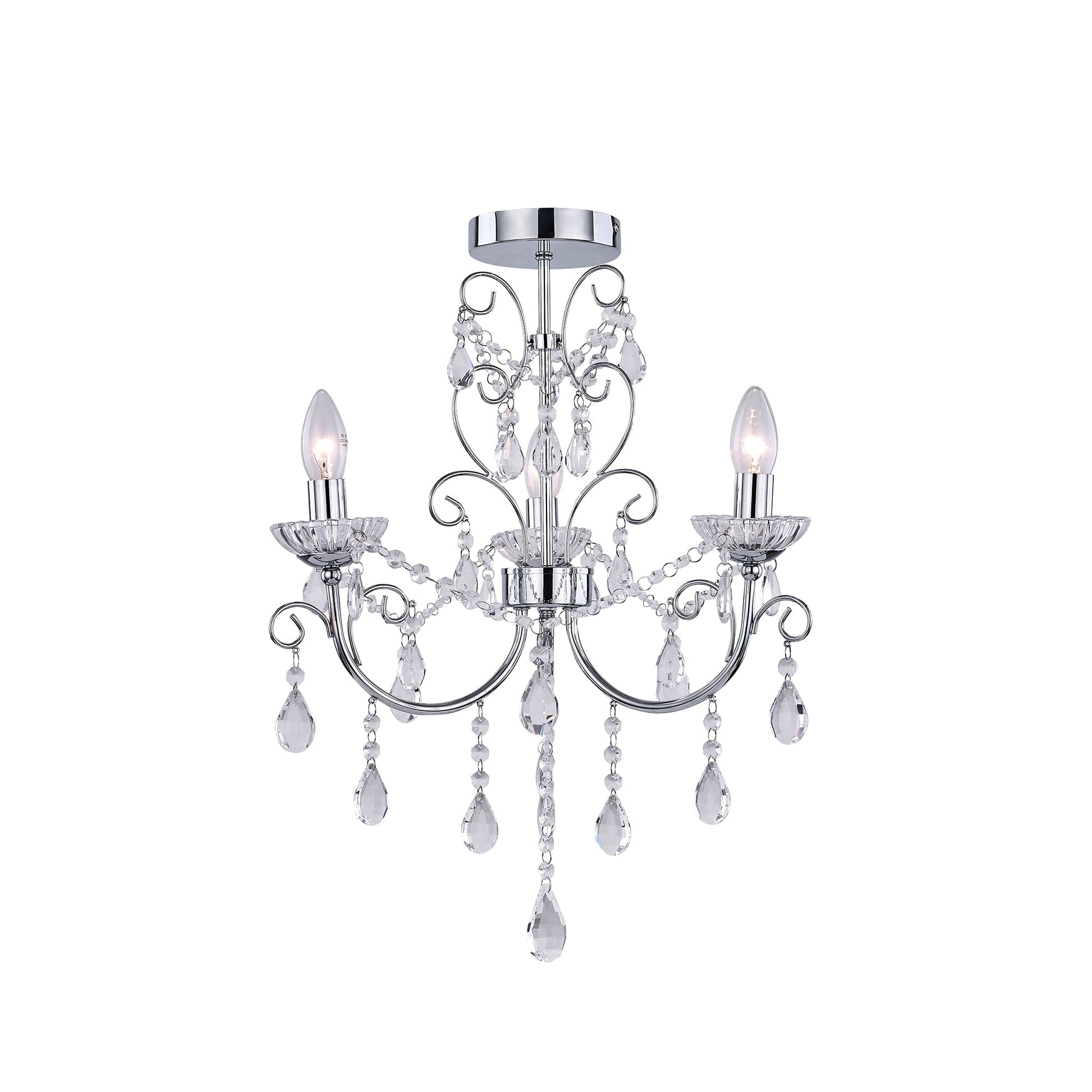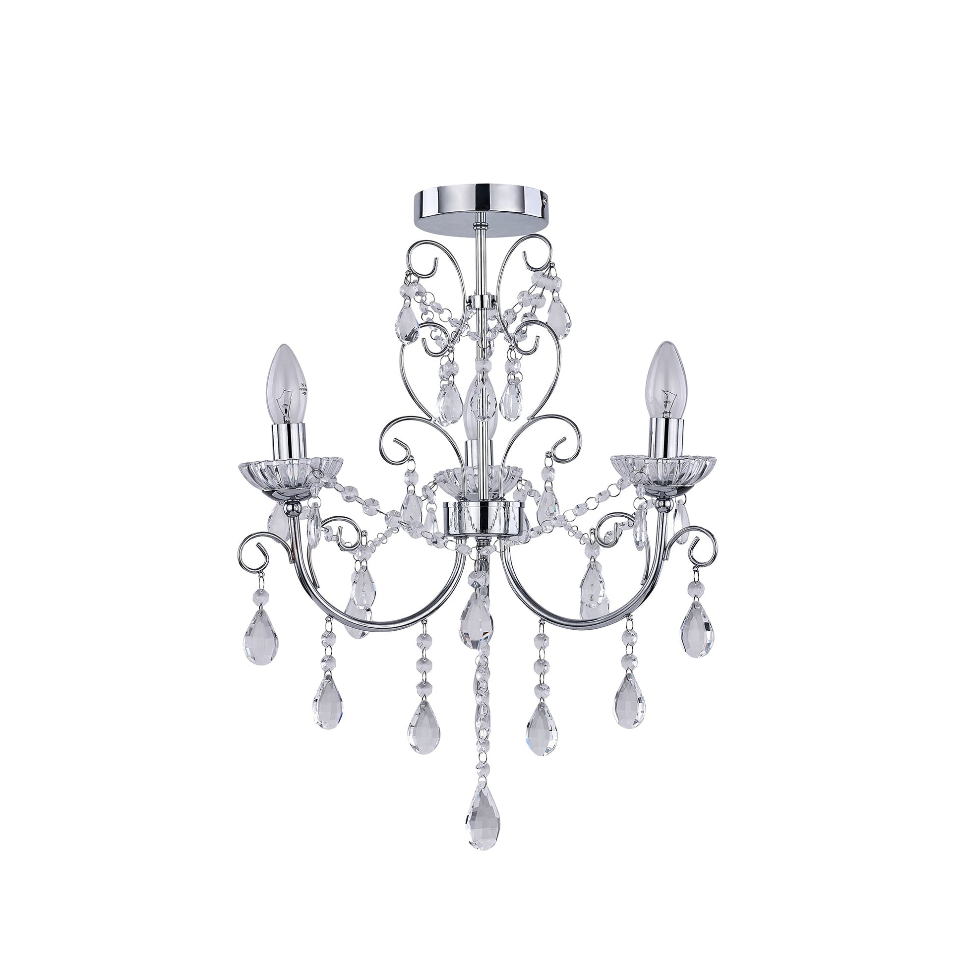 Elevate your living space with the Renaissance 3-Light Chandelier. This exquisite fixture, model no. LL002CH116S, exudes timeless charm and sophistication. Crafted with a blend of Metal and Crystal, its chrome finish and intricate detailing bring a touch of opulence to any room. Measuring H 550mm x W 450mm x D 450mm, this chandelier is a statement piece that seamlessly combines pastoral elegance with modern design. Illuminate your home with flair using this stunning chandelier. With three E14 bulb fittings and a maximum wattage of 40W, it offers both style and functionality. The crystal drops and ornate chrome accents create a luxurious ambiance, making it a focal point in any interior setting. Whether adorning a dining room or adding a touch of glamour to a hallway, the Renaissance 3-Light Chandelier is a must-have for those seeking to infuse their space with class and sophistication.Specifications