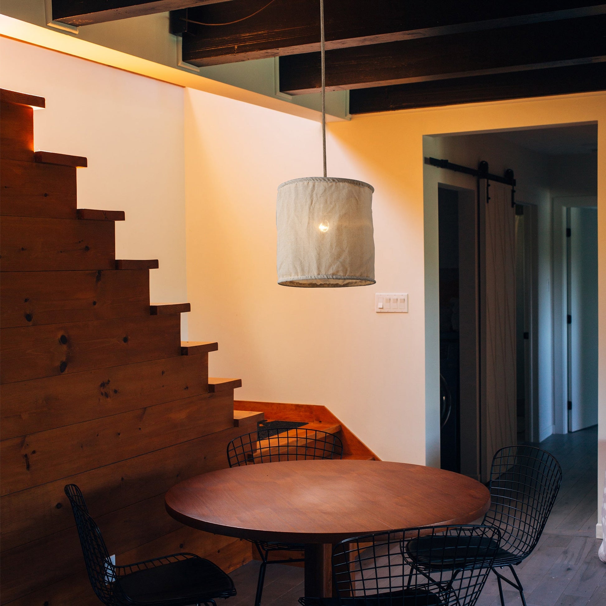- Soft ambient lighting with natural linen lampshades