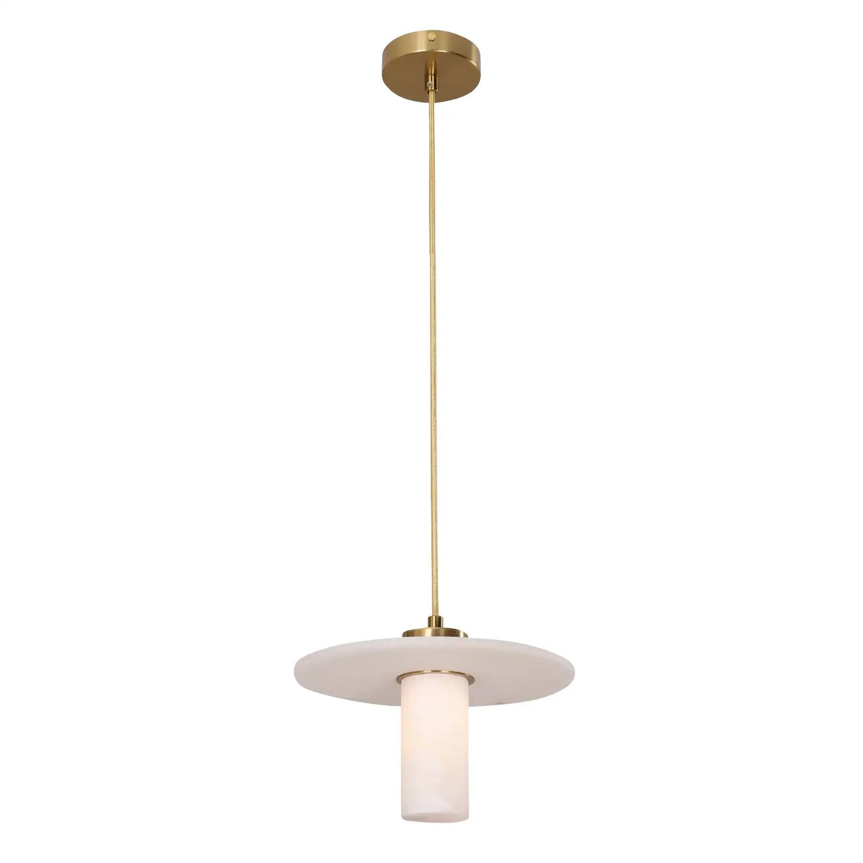 Elevate your indoor space with the LUCERNA Interior Cylinder Round Hat Alabaster Shade Brass Highlight Pendant Light. This exquisite single pendant light features a stunning white alabaster shade with brass highlights, exuding elegance and charm. The cylindrical shape and iron accents add a modern touch to any room. With a 1-year replacement warranty and a 3-meter golden fabric cable suspension, this pendant light is as durable as it is stylish. Illuminate your space with sophistication and quality craftsmanship.Specifications