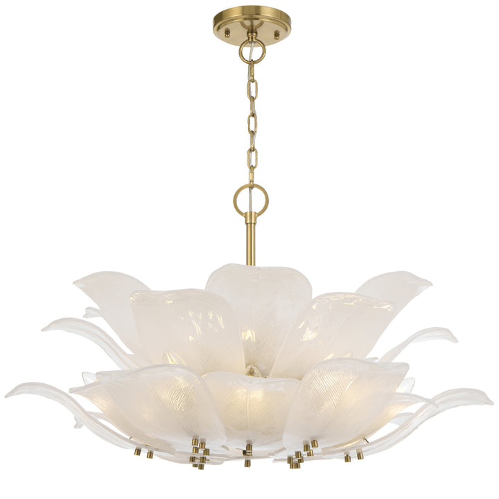 Elegance meets sophistication in the MONTE 12 Light Pendant. This exquisite lighting fixture features a refined brass frame with delicate frosted glass accents, evoking the beauty of natural leaf formations. Available in 8, 12, and 16-light pendant variations, the MONTE collection blends classic craftsmanship with contemporary allure, adding a touch of luxury and warmth to any space. With a diameter of 77.00 cm, height of 44.80 cm, and weighing 18.60 kg, this heavy 3-piece kit offers a timeless statement piece that can be a focal point or layered for a dramatic effect. Care for this piece by wiping clean with a dry cloth, avoiding strong liquid cleaners for maintenance.Specifications