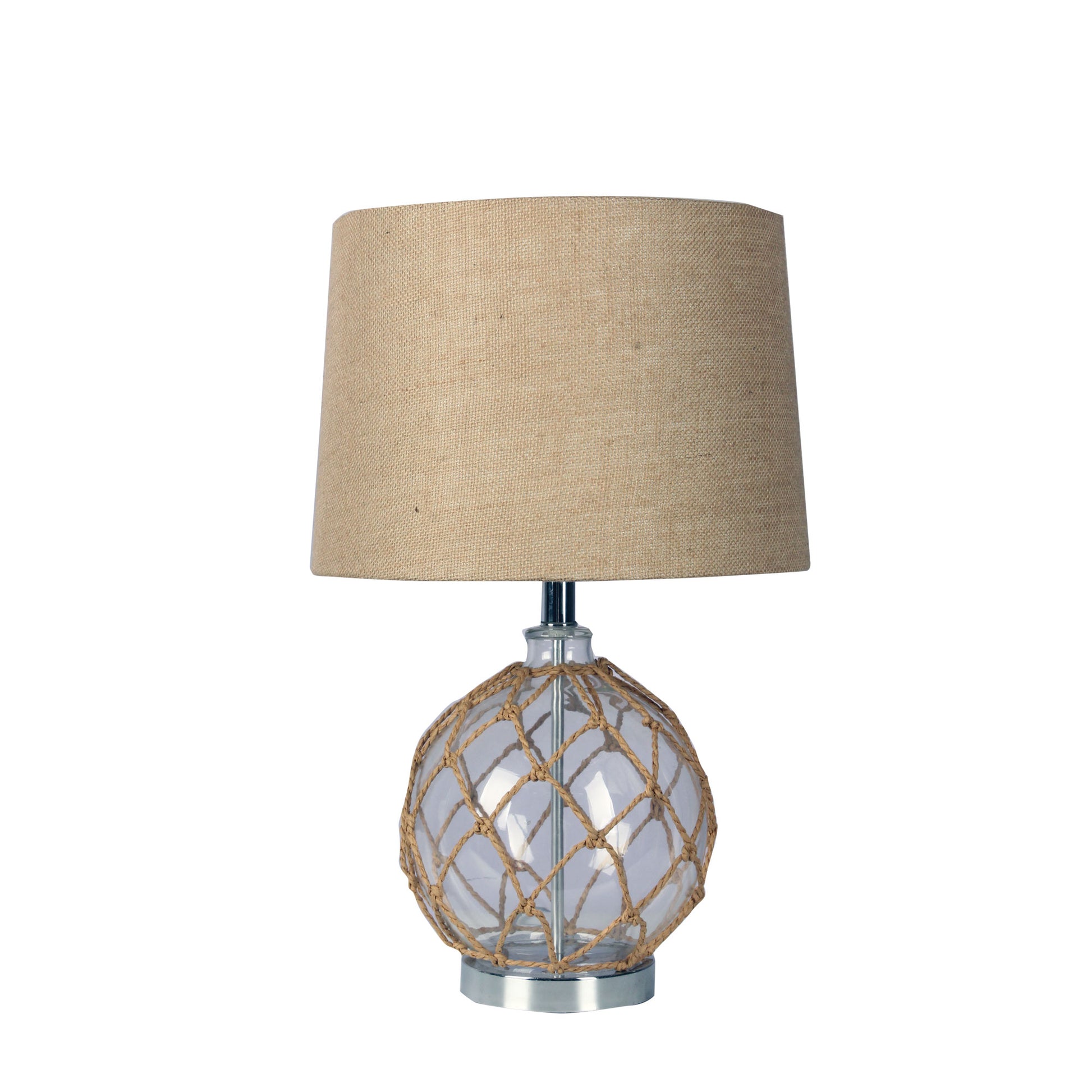 Elevate the ambiance of your coastal or Hamptons-inspired living space with the Yamba Table Lamp by Oriel Lighting. This stunning piece features a chrome pedestal adorned with a round glass base enveloped in a fishing-styled natural fiber netting, culminating in a large hessian tapered shade that exudes character and charm. The Yamba stands at an overall height of 55cm, emitting a warm glow through its E27 bulb socket, allowing for a maximum wattage of 42W. Complete with a hand switch on the cord, this lamp adds a touch of seaside elegance to any room.Specifications