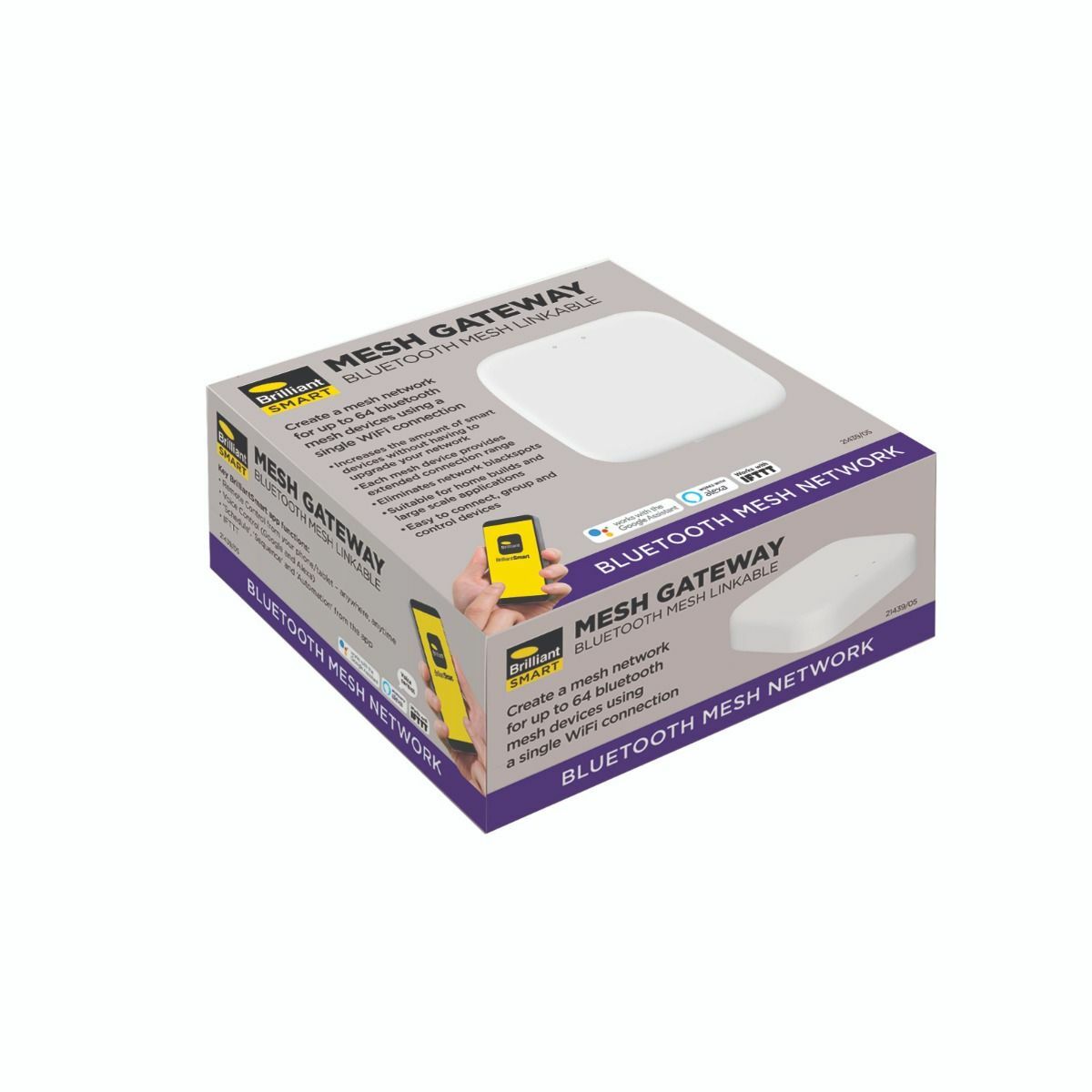 Elevate your smart home experience with the Brilliant Lighting Smart Mesh Gateway. This innovative device harnesses the power of Bluetooth mesh technology to seamlessly connect up to 64 compatible devices, creating a robust network that enhances connectivity throughout your living space. Say goodbye to network blackspots as this gateway effortlessly extends the reach of your smart devices, all while being easily controlled via the BrilliantSmart app. The gateway's sleek design, crafted from durable polycarbonate in a crisp white finish, blends seamlessly into any indoor environment, offering both style and functionality in one package. Designed for convenience and efficiency, the Brilliant Lighting Smart Mesh Gateway acts as the central hub of your smart home network, effortlessly linking all BrilliantSmart Mesh items through a single WiFi connection. With a focus on user-friendly operation, this gateway simplifies the management of your smart devices, allowing you to control them individually or in groups with ease. Its compact dimensions and simple installation process make it a versatile choice for both home builds and large-scale applications, providing extended connection range and the flexibility to combine multiple gateways for expanded coverage. Welcome to a new era of smart living with the Brilliant Lighting Smart Mesh Gateway.Specifications