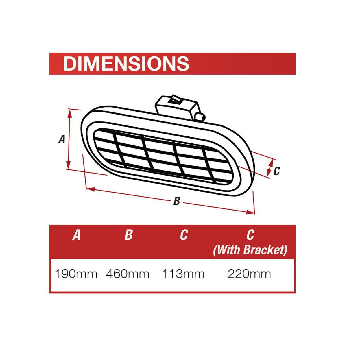 113mm Depth (220mm with bracket), 460mm Length, 190mm Width